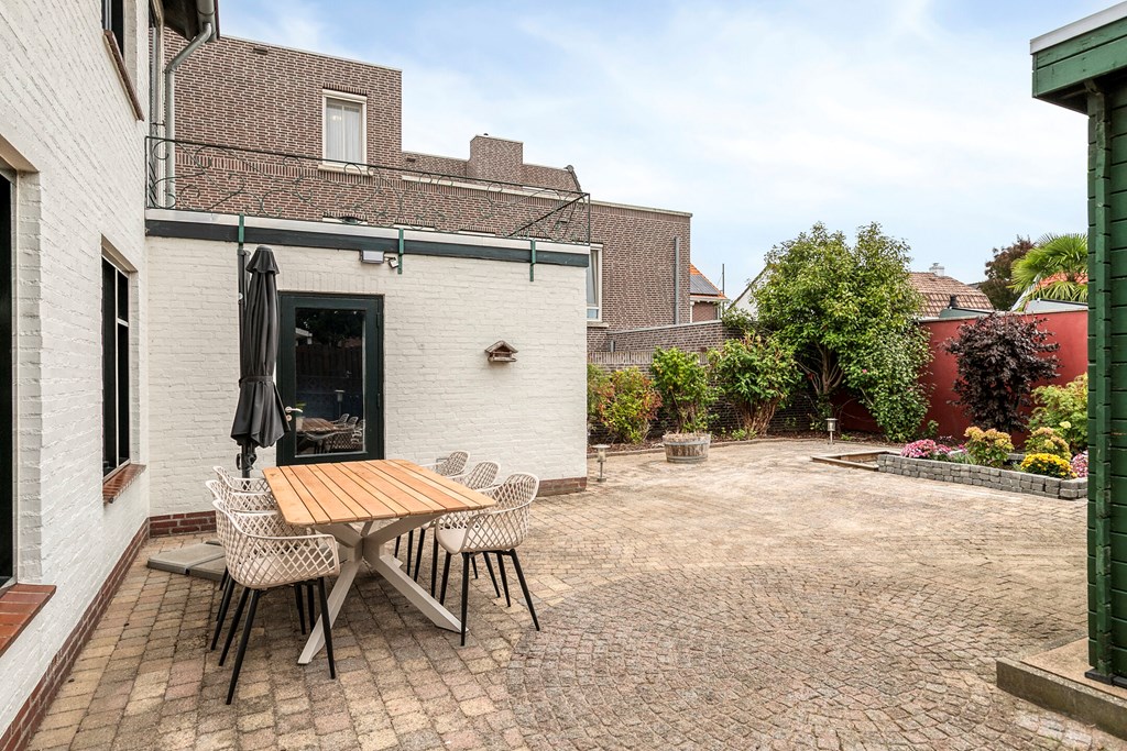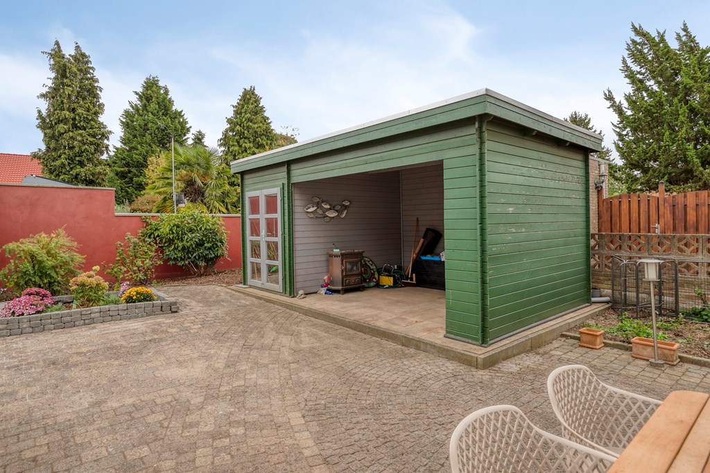 • Onderhoudsvriendelijke, volledig omheinde tuin met sierbestrating, borders met bloemen en planten, tuinhuis met overkapping en een achterom via de zijkant