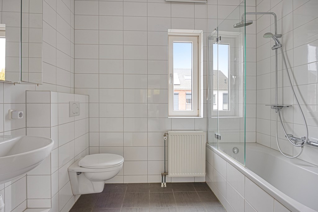De badkamer is modern, volledig betegeld en uitgerust met een ligbad/douchecombinatie, tweede toilet en wastafel in een eigentijdse kleurstelling.