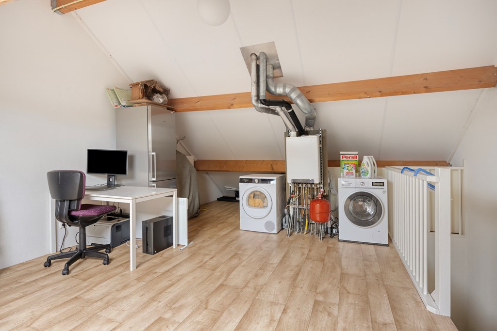 Via een vaste trap bereik je de ruime zolderverdieping – een ideale plek voor een extra slaapkamer, werkkamer of hobbyruimte. De zolder beschikt al over een Velux dakraam, aansluitingen voor wasmachine/droger en de C.V.-combiketel (Intergas, 2011).