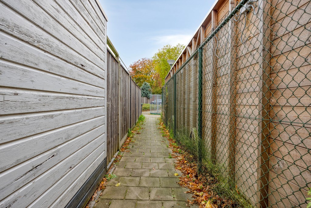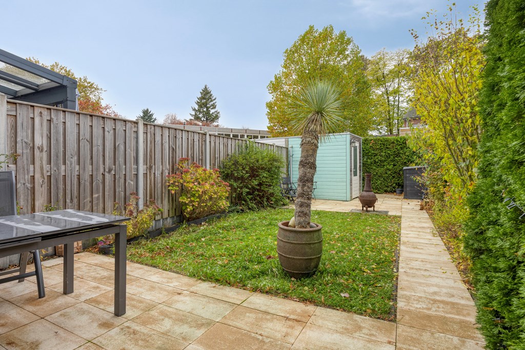 De zonnige achtertuin is fraai aangelegd, gelegen op het zuiden en voorzien van twee terrassen. Hier geniet je van rust, privacy en veel zonuren. De praktische berging biedt ruimte voor fietsen of tuingereedschap, en via de achterom bereik je gemakkelijk de straat.