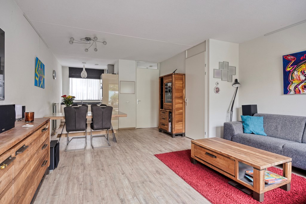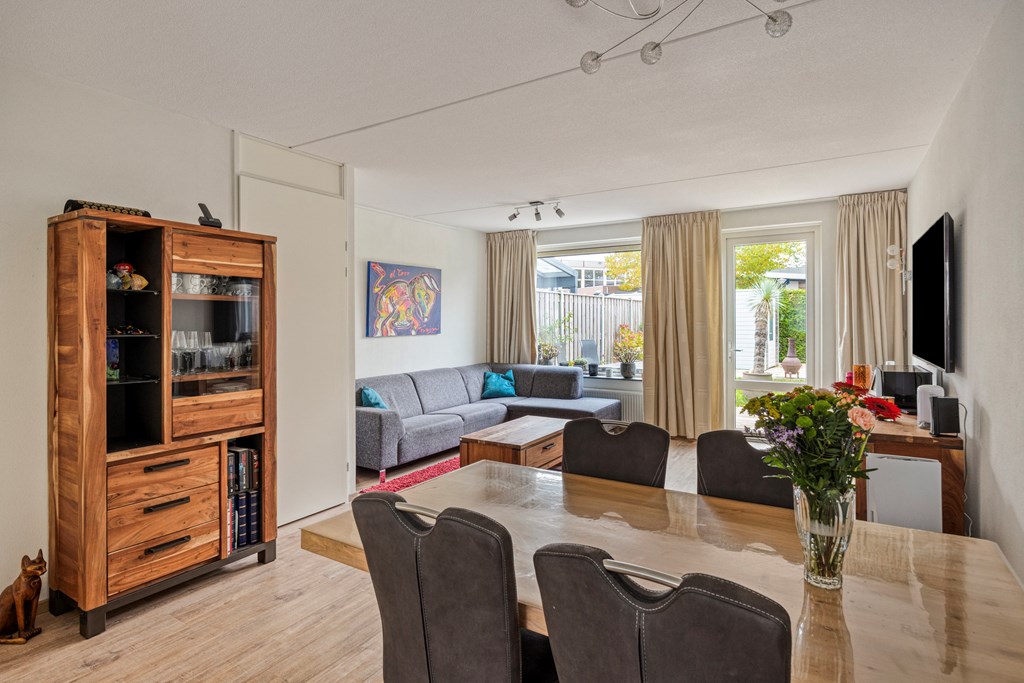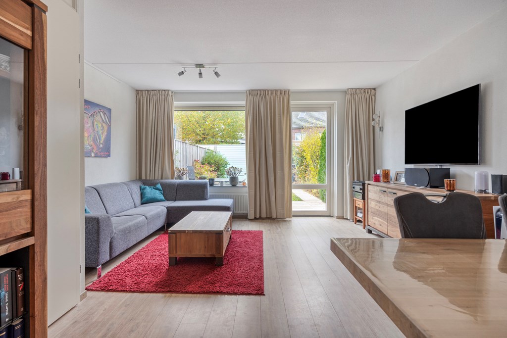 De woonkamer ligt aan de achterzijde en is voorzien van een strakke laminaatvloer, gladde wanden en een praktische bergkast. Via de loopdeur stap je zo de zonnige tuin in.