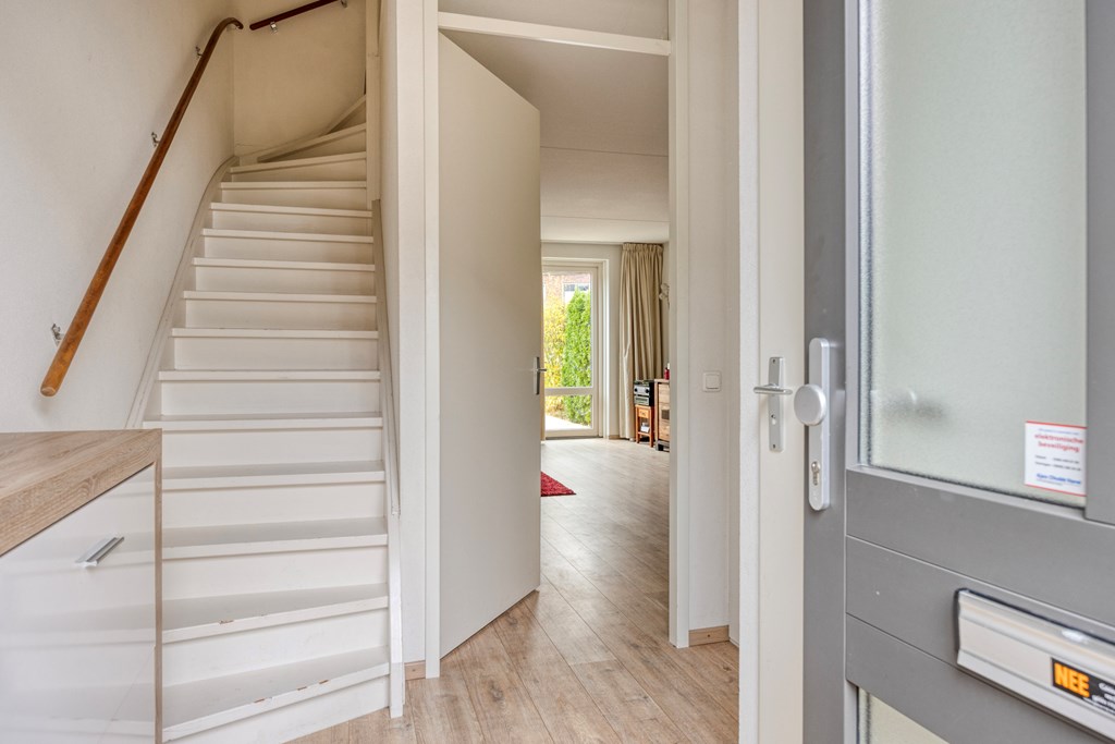 Je komt binnen in de ruime hal met toilet, moderne meterkast en toegang tot de lichte woonkamer.
